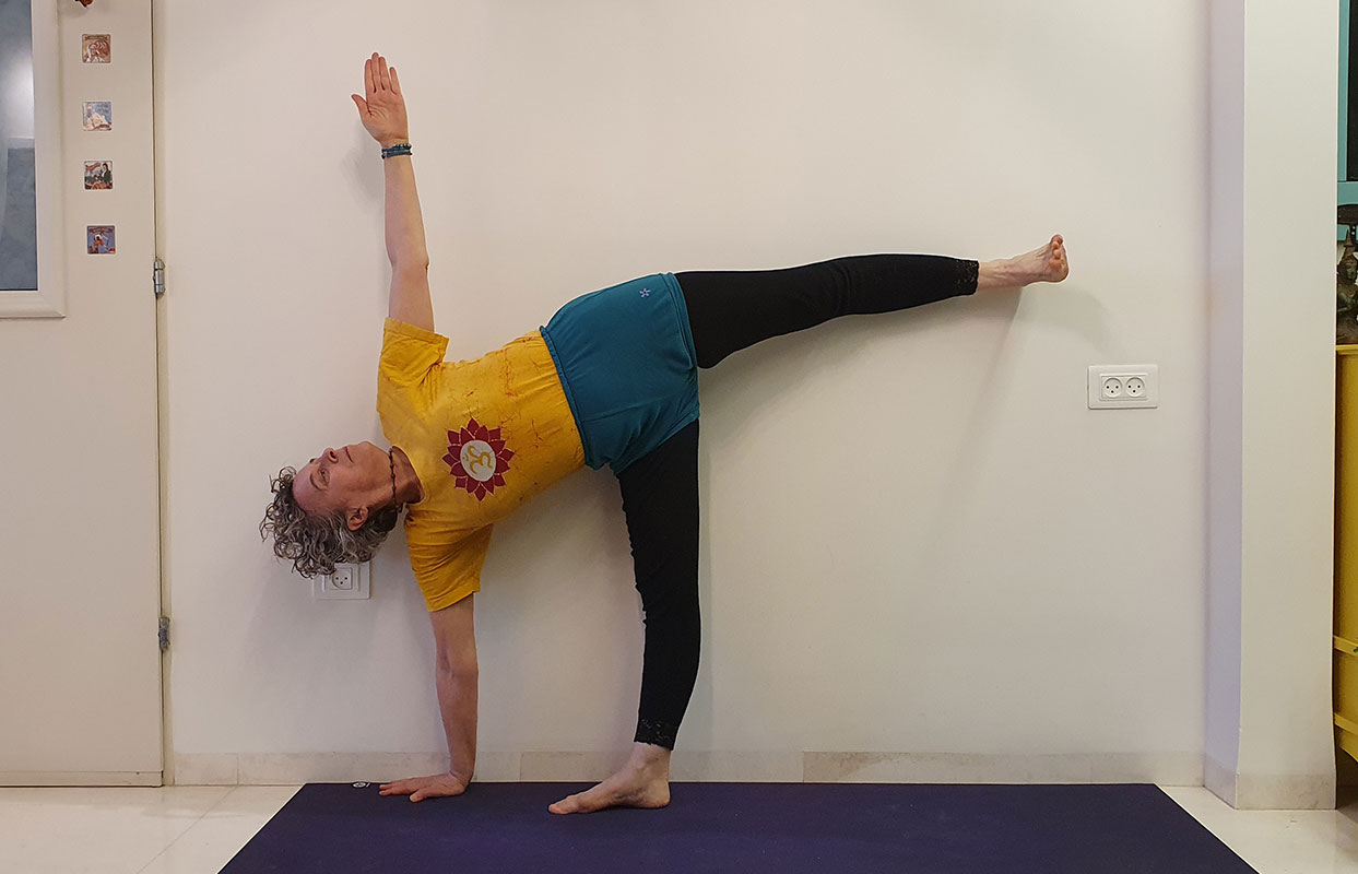 כופפו את הרגל הימנית, הביאו את משקל הגוף על כף רגל ימין. הביאו את כף יד ימין לצד כף הרגל וקרבו את הרגל האחורית השמאלית.